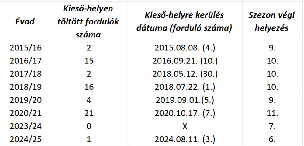 A DVTK statisztikái a kieső-zónában a 2015/16-os idény kezdete óta: