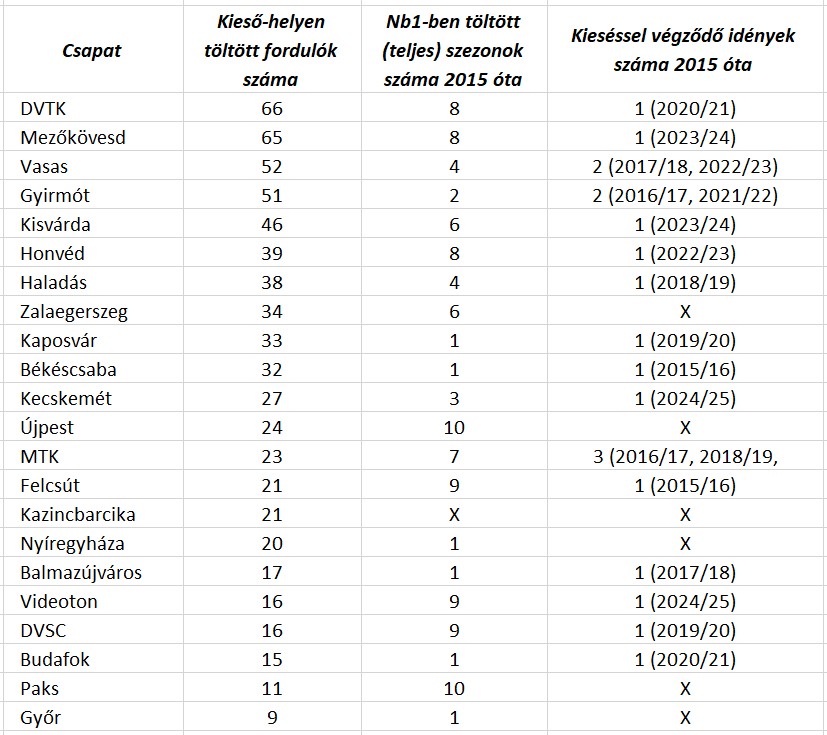 A 12-csapatos bajnokság bevezetése óta ennyi időt töltöttek az NB1-es csapatok a veszély-zónában - zárójelben a csapat kieséseinek száma az említett időszakban