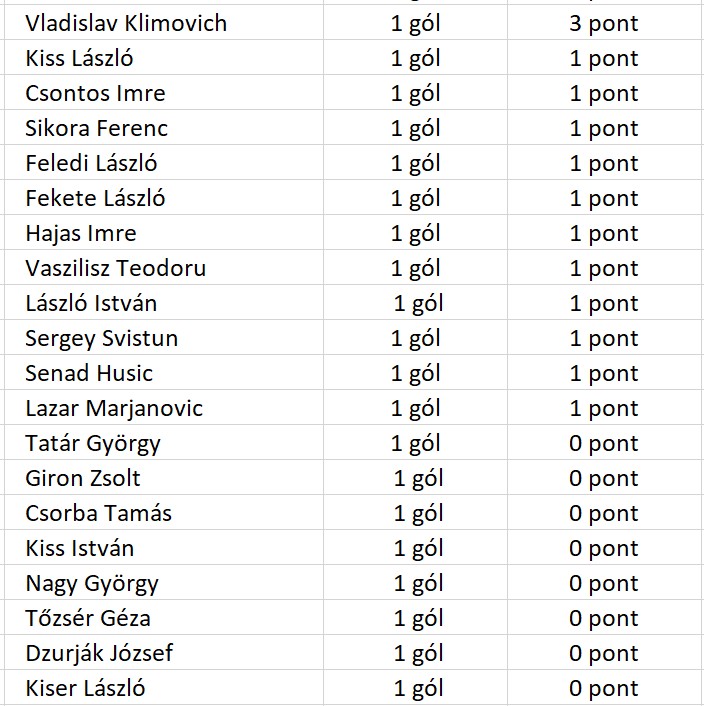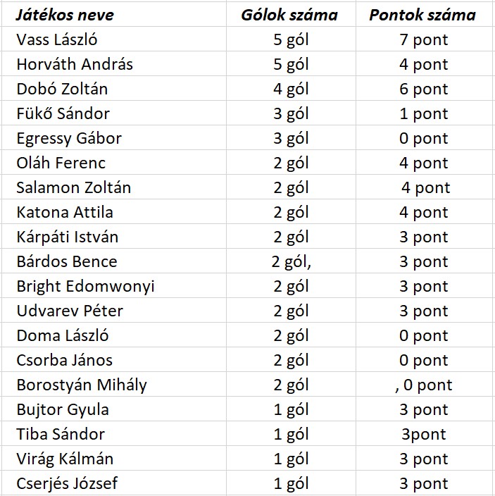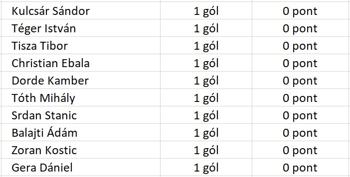A DVTK összes NB1-es gólszerzője a Győri ETO ellen rangsorolva aszerint, hogy góljaik hány pontot értek a csapatnak: