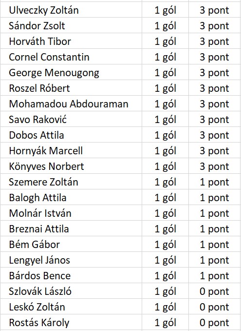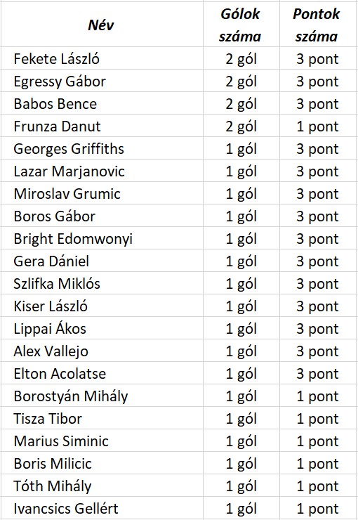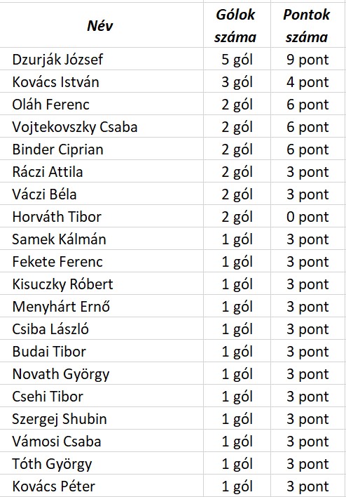A DVTK összes bajnoki gólszerzője a Nyíregyháza Spartacus ellen, rangsorolva aszerint, hogy hány pontot ért gólja: