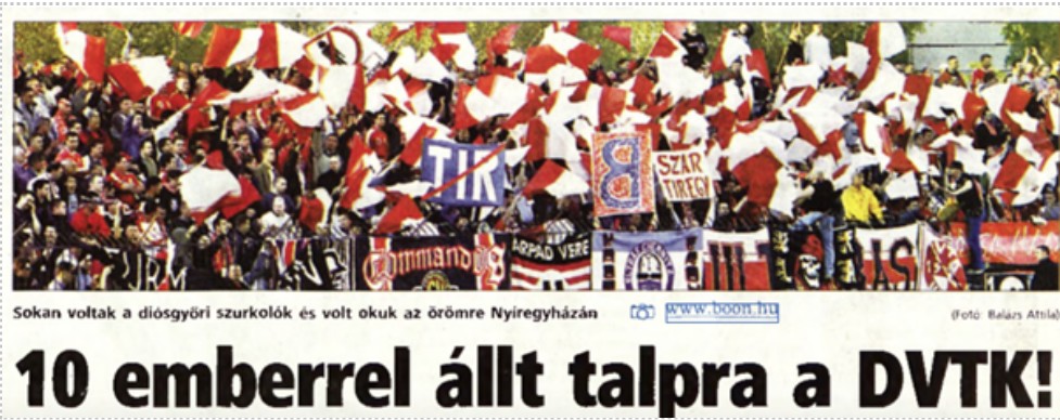 Szombat délután a DVTK a Nyíregyházi Városi Stadionban lép pályára a labdarúgó NB1 27. fordulójában. A két riválist mindössze három pont választja el a tabellán a játéknapot megelőzően, a két és fél hónapos hiátus után visszatérő diósgyőri ultrák pedig szokásukhoz hűen ismét a legmagasabb minőségű szenvedélyt és gyűlöletet hozzák majd magukkal a Nyírség városába. Ezek fényében a várhatóan telt ház előtt megrendezett keleti derbi egészen biztosan minden idők egyik legnagyobb kiesési rangadóját hozza majd a magyar labdarúgás egyetemes történelmében - minden diósgyőrire szükség lesz, aki csak tudja, váltsa meg jegyét a vendégszektorba!