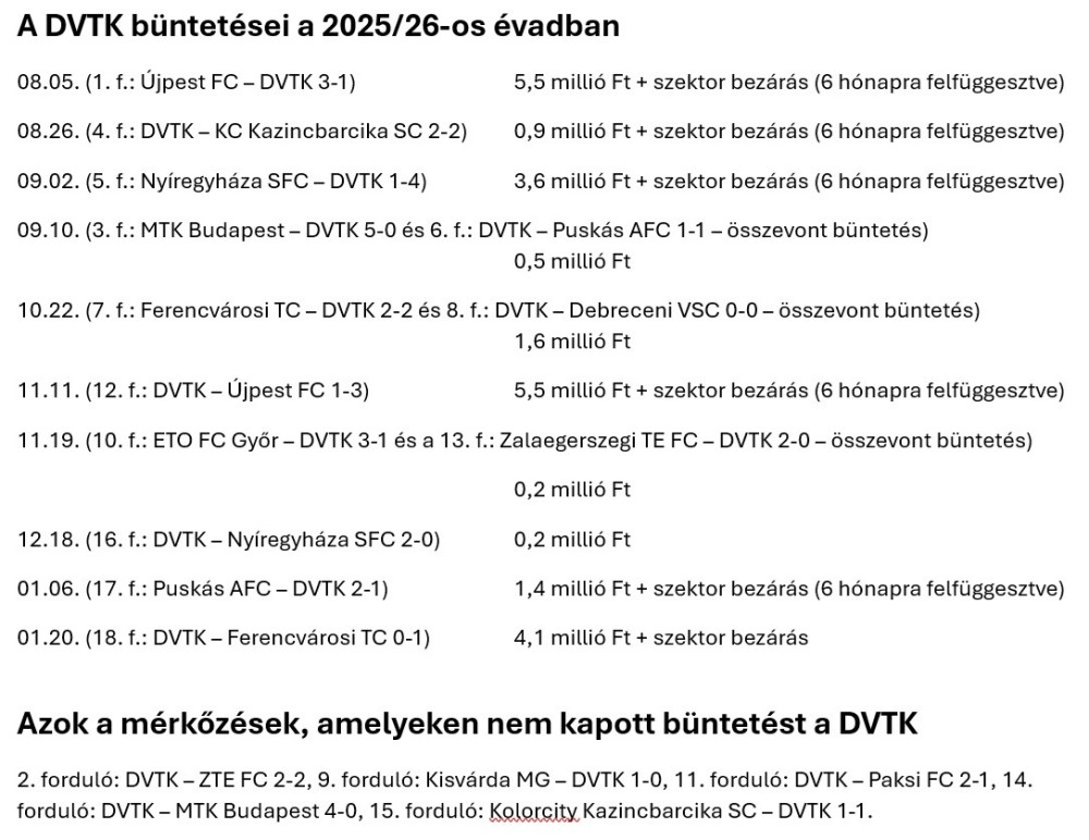 Mindez azt is jelenti, hogy a 2025/26-os évad őszi szezonjában lejátszott 18 bajnokija közül csak 5 alkalommal nem kapott büntetést a DVTK, 13-szor viszont pénzbüntetéssel sújtották a klubot, összességében 23,5 millió forint értékben, és e mellett hat alkalommal szektorbezárást is elrendeltek a diósgyőri klubbal szemben (ezek közül öt felfüggesztett volt, egy pedig, az FTC elleni, azonnali).