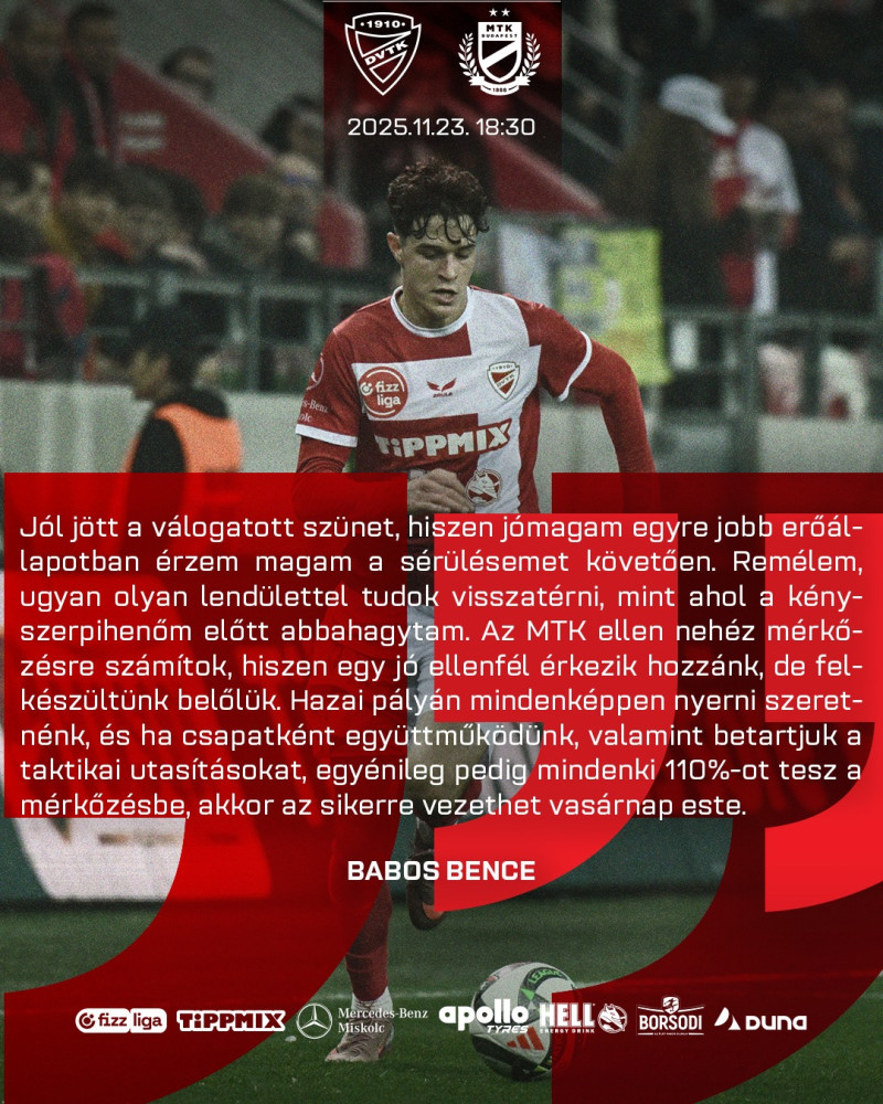 Babos Bence meccsváró gondolatai a vasárnap esti DVTK - MTK Budapest mérkőzés előtt.
