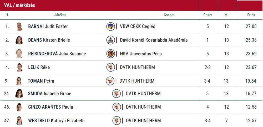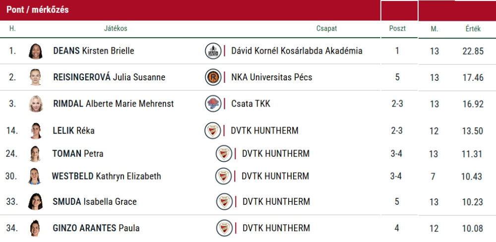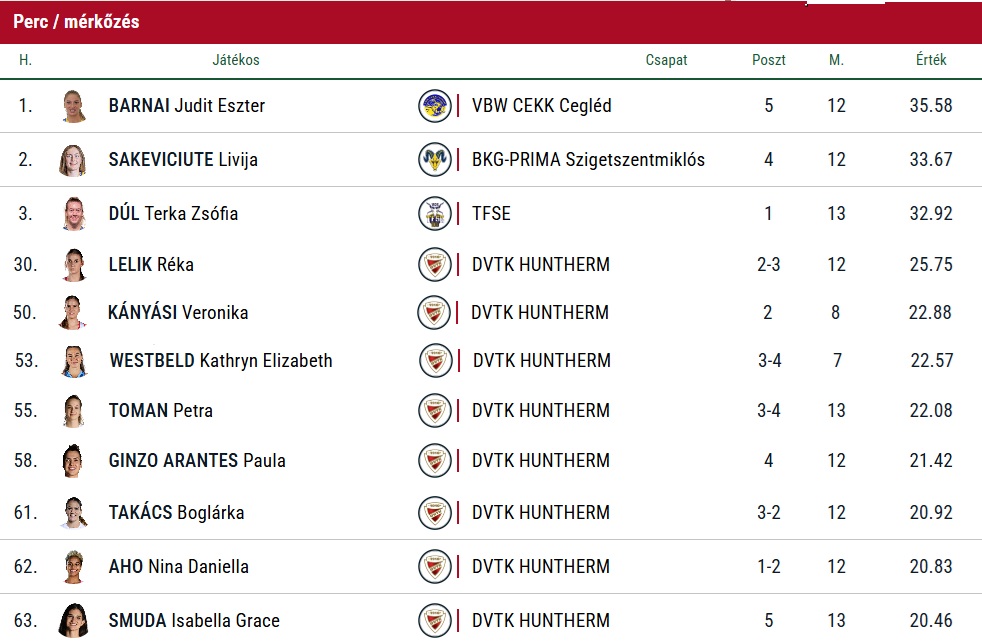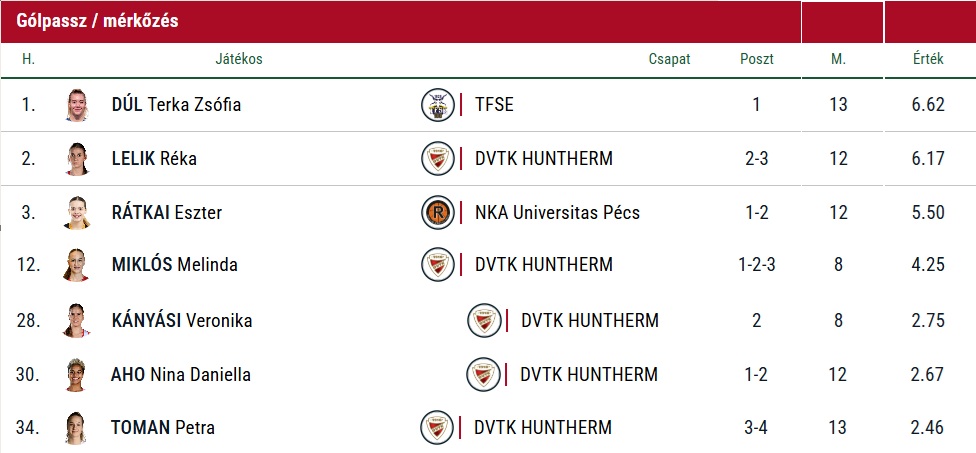 Lelik Réka a teljes mezőnyben a 2. legmagasabb mutatót produkálta, Miklós Melinda 4,25 assziszt/meccs mutatója pedig kis híján befért az első tízbe.