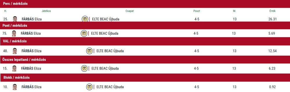 Sokan felkaphatják a fejüket azon, hogy négy mutatót tekintve is a ceglédi csapat centere, Barnai Judit áll az élen. A válogatottba is visszatért center egyarán első a játékperceket, a teljesítmény-index mutatót, az összes lepattanót és a blokkokat tekintve is. Ez nem kis teljesítmény, gratulálunk hozzá.