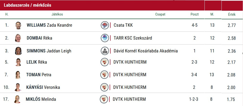 Akik nyomon követik a DVTK HUNTHERM mérkőzéseit, azoknak nem okozhat különösebb meglepetést, hogy a lepattanó és a blokk kivételével valamennyi mutató tekintében első hegedűsünk, Lelik Réka áll az első helyen játékosaink közül.