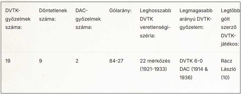 Ami az egymás elleni eredményeket illeti, a mérleg nyelve ebben a tekintetben méginkább a DVTK felé billent: a 30 hivatalos diósgyőri derbi során 19 alkalommal hódították el a “munkások” a győzelmet, kilenc alkalommal nem bírtak egymással a vasgyáriak, a tisztviselők mindössze két diadalt ünnepelhettek nagyközségi riválisaik felett. A két csapat első hivatalos mérkőzésére eleinte már 1913-ban sor kerülhetett volna, a DAC halasztási kérelme miatt azonban csak 1914 tavaszán rendezték meg az első “Diósgyőri Clasicót”. A vasgyári munkások elsöprő (6-0) győzelmet arattak Stefáni Gusztáv, Bova Ernő, illetve Páva Gusztáv duplájának köszönhetően, az első tíz rangadóból pedig összesen nyolcat nyertek meg a piros-fehérek. A tisztviselők 1921 áprilisában ünnepelték első derbigyőzelmüket (2-1), az ezt követő alkalomra viszont több, mint tizenkét évet kellett várnia a sárga-kék gárdának: az addig lejátszott 22 DVTK-DAC afférból 13 végződött munkás-dicsőséggel, 9 diósgyőri-clasicón nem született győztes.