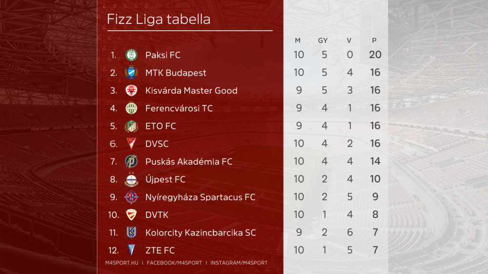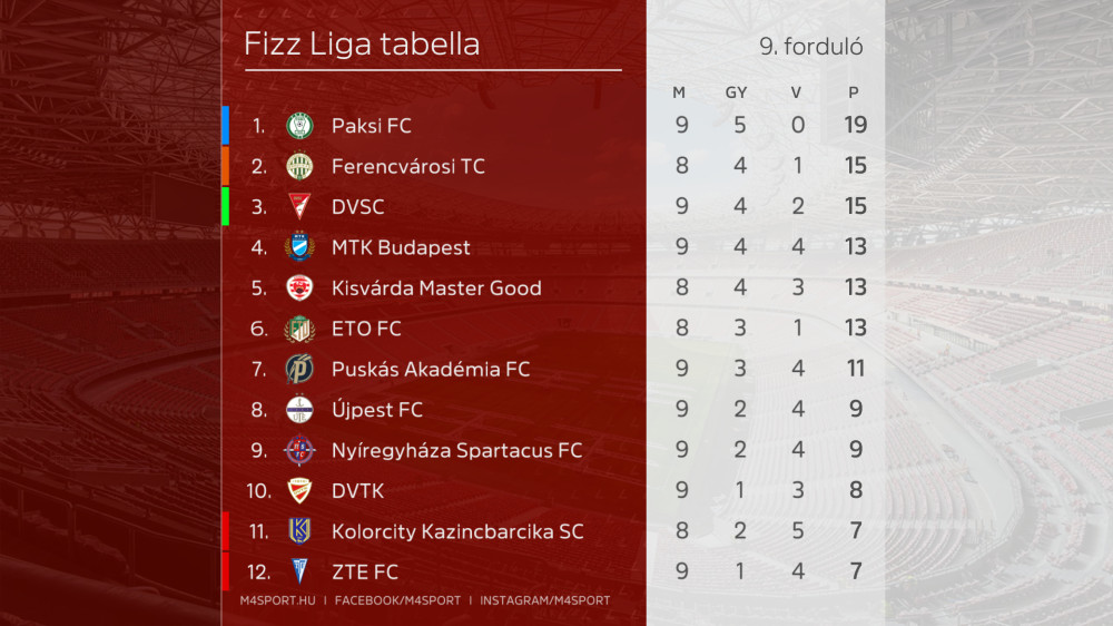 Így nézett ki a tabella a 9. fordulót megelőzően, vagyis érezni lehetett: ha a papírforma javarészt jön és mondjuk nyer (vagy legalább nem kap ki) a Puskás, ETO, Fradi, Kisvárda, MTK ötösfogat, akkor az aljától tisztes távolságra lehet kerülni. Így is lett, az FTC döntetlenje mellett a többiek behúzták a maguk bajnokiját, ami egy hét-ötös felállást eredményezett a táblázaton, közte egy relatíve nagy, négypontos különbséggel, s lett a 10. forduló utánra ez a képlet: