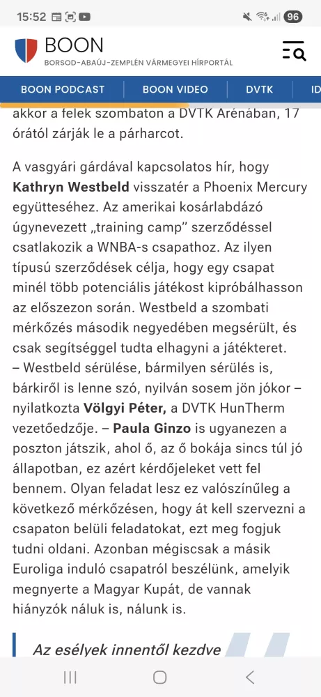 Magyar Bianka: – A párharc tétje a mi vállunkat nyomta, mert hazai pályán kulcsfontosságú az első mérkőzés. Görcsösen kezdtünk, a második negyedben külső-belső egyensúly felbomlott, nem voltak külső dobásaink, nagyon behúzódott a TF, jól védték a festéket. Tudjuk, hogy ellenfelünk előszeretettel dobja a triplákat, most is volt huszonnyolc kísérlete, emellett nagy különbségnél sem adják fel, küzdenek a végsőkig. Szeretnénk lezárni szombaton a párharcot, de nem lesz egyszerű.