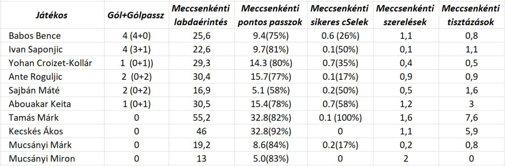 A hódmezővásárhelyi Kecskés Ákos is az Újpest FC-nél kezdte profi karrierjét, azóta számtalan egyesületnél megfordult, a piros-fehérekhez a ciprusi AEL Limassoltól érkezett. Eddig a védelem egyik legproduktívabb játékosának bizonyul, mindössze három bajnokin nem lépett pályára, az egész csapatban csak Vallejo (40.4) tud felmutatni több pontos passzt mérkőzésenként a korábbi magyar válogatottnál (32.8), ráadásul a meccsenkénti tisztázások tekintetében (5.9) is csak Tamás Márk előzi meg (7.6) a háziranglistán. A most nyáron visszatérő Tamás Márk az egyetlen új igazolás, akinek több meccsenkénti labdaérintése (55,2) van Kecskésnél (46,0). Az őszintét megmondva, a szezon elején gyanakodtam a korábban az Atalantában is megforduló hátvéd igazolásának hatásosságában, de a Nyíregyháza-PAFC-Loki trió elleni teljesítményével azóta meggyőzött.