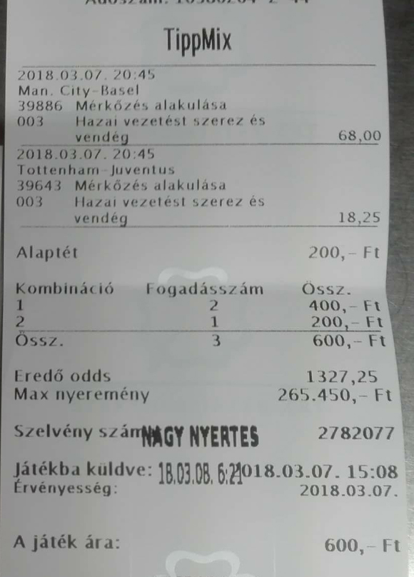 Tamás fogadta a gratulációt, de azt mondta, nagy titkokat nem tud velünk megosztani ezzel kapcsolatban. Egyszerű megérzés volt a részéről. Átnézte az adott nap eseményeit, és szinte biztos volt a Basel sikerében. Az, hogy egy külön kitétellel játszotta a vendéggyőzelmet - mégpedig hogy a hazai csapat szerez vezetést - csak a szerencsének tudható be. Ehhez még hozzácsapta a Juventust is, "ha már ott van" alapon, és milyen jól tette!