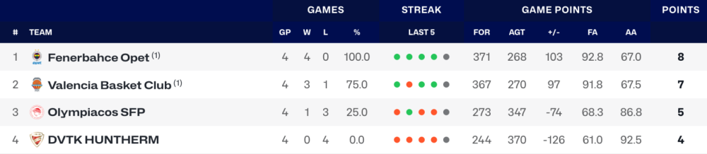 A héten rendezték az Euroliga negyedik fordulóját. A Sopron Basket Franciaországban, a DVTK HUNTHERM Törökországban maradt alul. Mindkét magyar gárda nyeretlen a sorozatban.