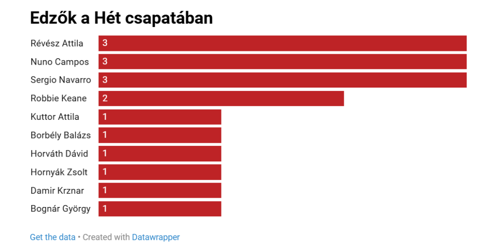 Annyit talán elárulhatunk, hogy az edző kiválasztásánál előnyt élvezett az, ha valaki még nem, vagy régen volt a Hét csapatában, persze a teljesítmény után, ha mondjuk két hasonló teljesítményt nyújtó csapat trénere pályázott. Ennek megfelelően hármas holtverseny az első három helyen, Révész Attila, Nuno Campos és Sergio Navarro révén, de előbbit talán kikiálthatjuk győztesnek, hiszen ő csak az ősz második felében irányította vezetőedzőként is a Kisvárdát, vagyis jóval kevesebb alkalommal tudtuk kiválasztani. Kétszer csak Robbie Keane-t választottuk, a többi edzőt egyszer-egyszer, még az őszi bajnok Győrt irányító Borbély Balázs is. Az egész őszt végigdolgozó vezetőedzők közül csak Vladimir Radenkovics nem irányíthatta egyszer sem a Hét csapatát, míg a kiesőhelyen álló Nyíregyháza az egyetlen, amely két különböző szakvezetőt is delegált a válogatottunkba, nem meglepő módon Szabó István és Bódog Tamás személyében.