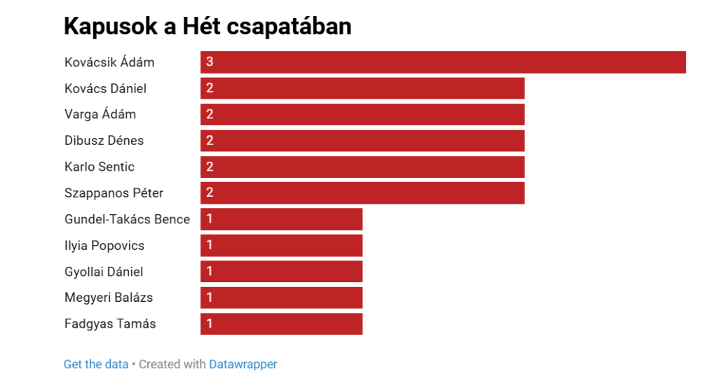 Talán elsőre furcsa, de a gólvonalon eddig Kovácsik Ádám a király, háromszor is beválasztottuk, az Újpest és az MTK idegenbeli legyőzése, valamint a DVSC elleni hazai 0–0 során is. Kétszer szerepelt a válogatottban Karlo Sentic, Szappanos Péter, Dibusz Dénes, Kovács Dániel, egyszer pedig Gundel-Takács Bence, Ilya Popovics, Gyollai Dániel, Megyeri Balázs és Fadgyas Tamás. Utóbbi kettő azért is szép teljesítmény, mert mindössze három, illetve egy meccsük volt.