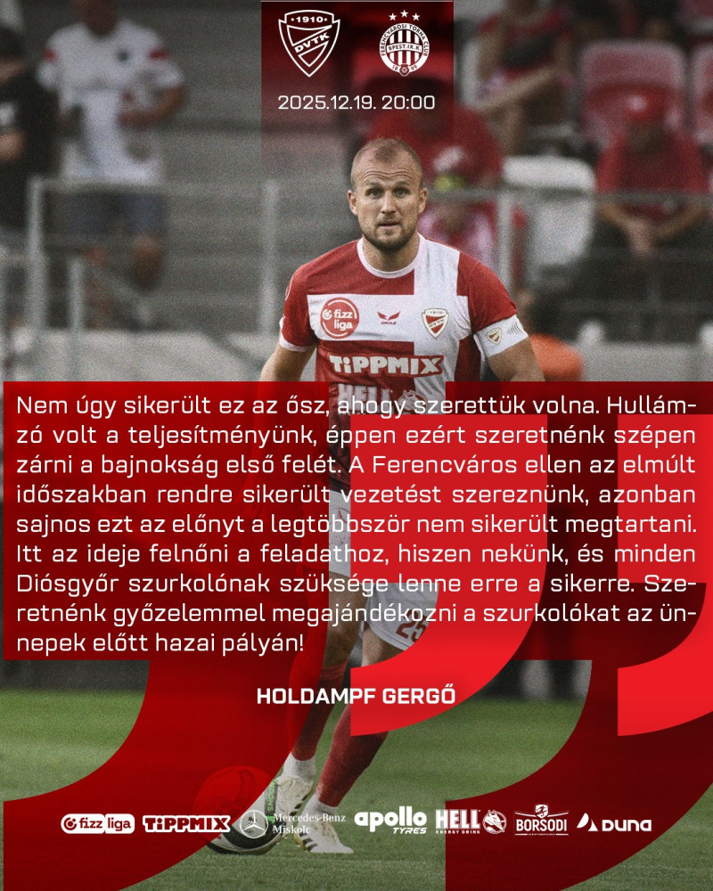 Nem úgy sikerült ez az ősz, ahogy szerettük volna. Hullámzó volt a teljesítményünk, éppen ezért szeretnénk szépen zárni a bajnokság első felét. A Ferencváros ellen az elmúlt időszakban rendre sikerült vezetést szereznünk, azonban sajnos ezt az előnyt a legtöbbször nem sikerült megtartani. Itt az ideje felnőni a feladathoz, hiszen nekünk, és minden Diósgyőr szurkolónak szüksége lenne erre a sikerre. Szeretnénk győzelemmel megajándékozni a szurkolókat az ünnepek előtt hazai pályán.