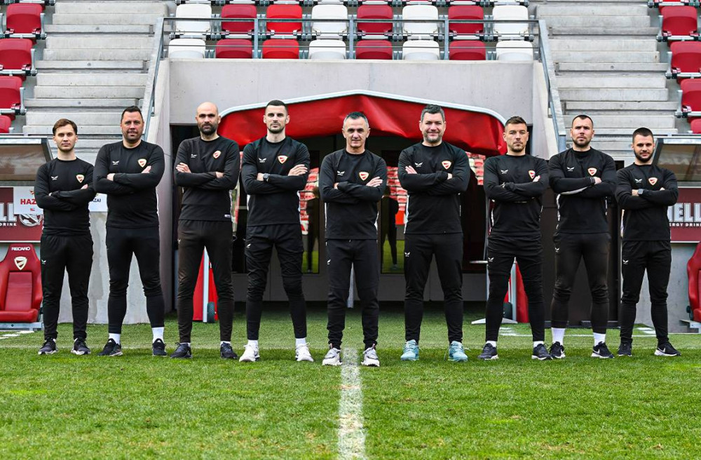 A képen balról-jobbra: Bakó Botond adatelemző, Tuska János kapusedző, Póti Krisztián videóelemző, Filip Jorgić erőnléti edző, Nebojša Vignjević vezetőedző, Miloš Bogićević másodedző, Takács Péter másodedző, Hanák Attila erőnléti edző és Dobó László performance coach