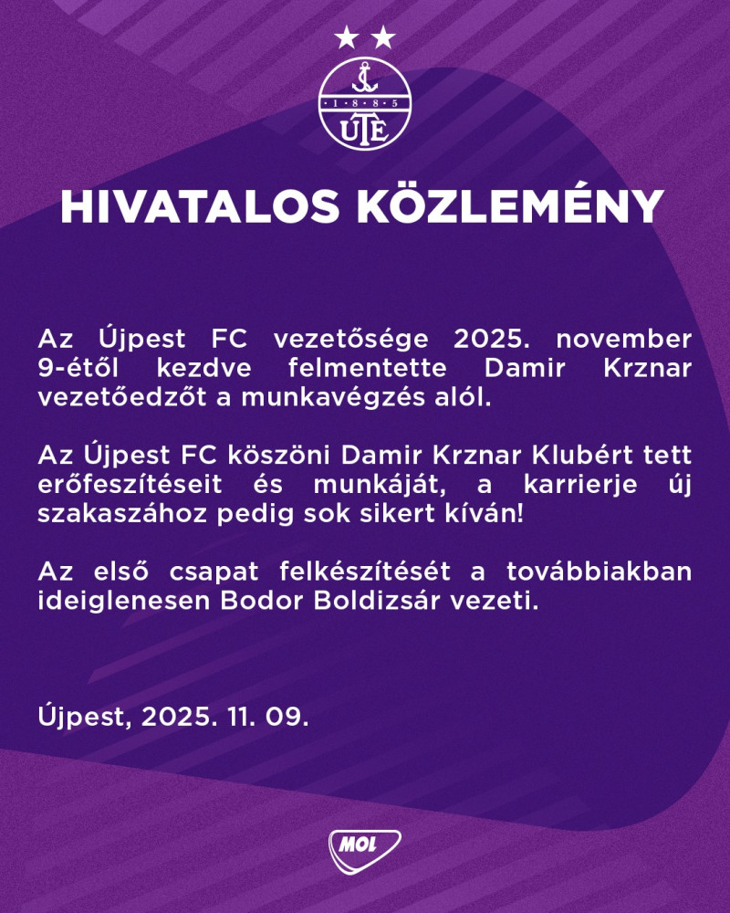 Az nb1.hu adta hírül, hogy felmentette a munkavégzés alól Damir Krznar vezetőedzőt az Újpest. A klub vasárnap késő esti közleményben számolt be arról, hogy ideiglenesen Bodor Boldizsár látja el a pozícióval járó feladatokat.