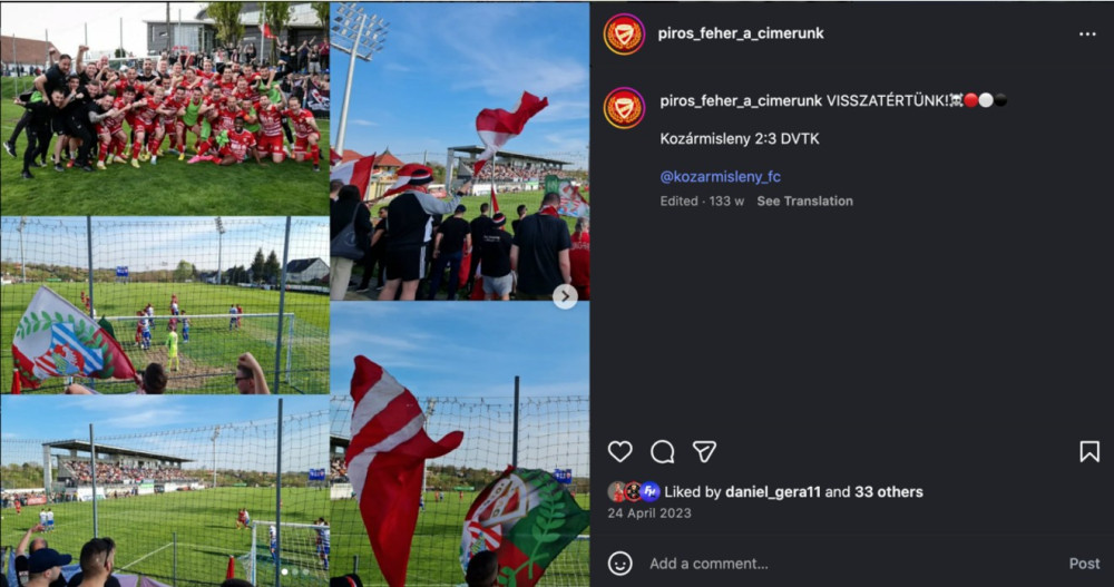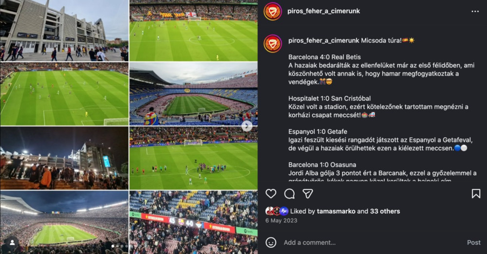 Egy valakit viszont nem említettem az utóbbi felsorolásban, méghozzá személyes kedvencemet, Piros_Feher_A_Cimerunk. A PFAC rövidítésre hallgató account 2019 áprilisa óta tevékenykedik a vörös-kék tartalommegosztón, és szinte heti rendszerességgel érkeznek a posztok elsősorban diósgyőri, de nem ritkán külföldi bajnoki mérkőzésekről, illetve különféle beszámolók stadionokról. Emellett az oldal nyomon követi Tamás Márk pályafutását.